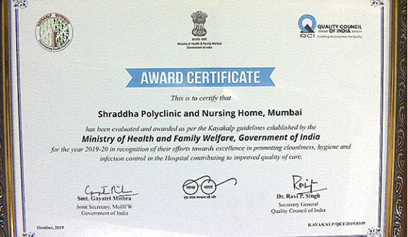 In it’s constant endeavour to provide quality & safe services to the patient Shraddha Polyclinic & Nursing Home has taken one step ahead. Shraddha Polyclinic & Nursing Home has enrolled itself under "Kayakalp" which is an initiative by the Union Minister for Health & Family Welfare.
