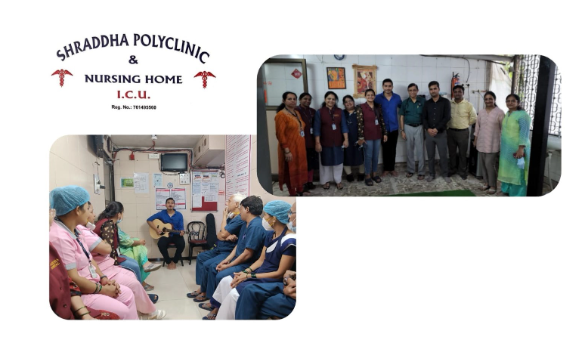The Management of Shraddha Polyclinic and Nursing Home had organised a music session for its staff. The singer (Mr. Anshuman Gautam) played songs on his guitar. The staff enjoyed the session and also sang along. The session was organised for mental health of the staff.