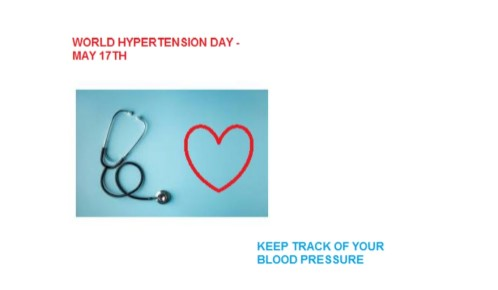 High Blood Pressure is the main risk factor for cardiovascular diseases including coronary heart disease and strokes.  Can also lead to chronic kidney diseases and heart failure. World Hypertension Day  focuses on creating awareness for early diagnosis and avoiding complication.
